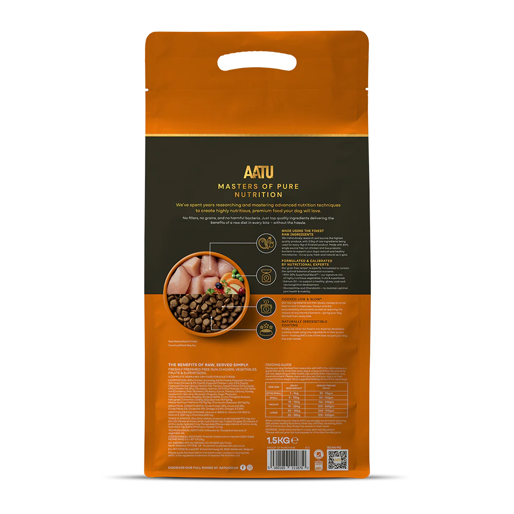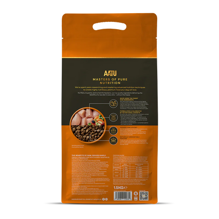 AATU Chicken is handcrafted in small batch recipes, naturally made without artificial colours, without artificial preservatives, without artificial flavours and without GM ingredients. The fresh and raw protein is pre-cooked using our "low & slow"TM method to ensure efficient digestion of the meats.