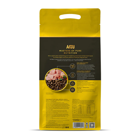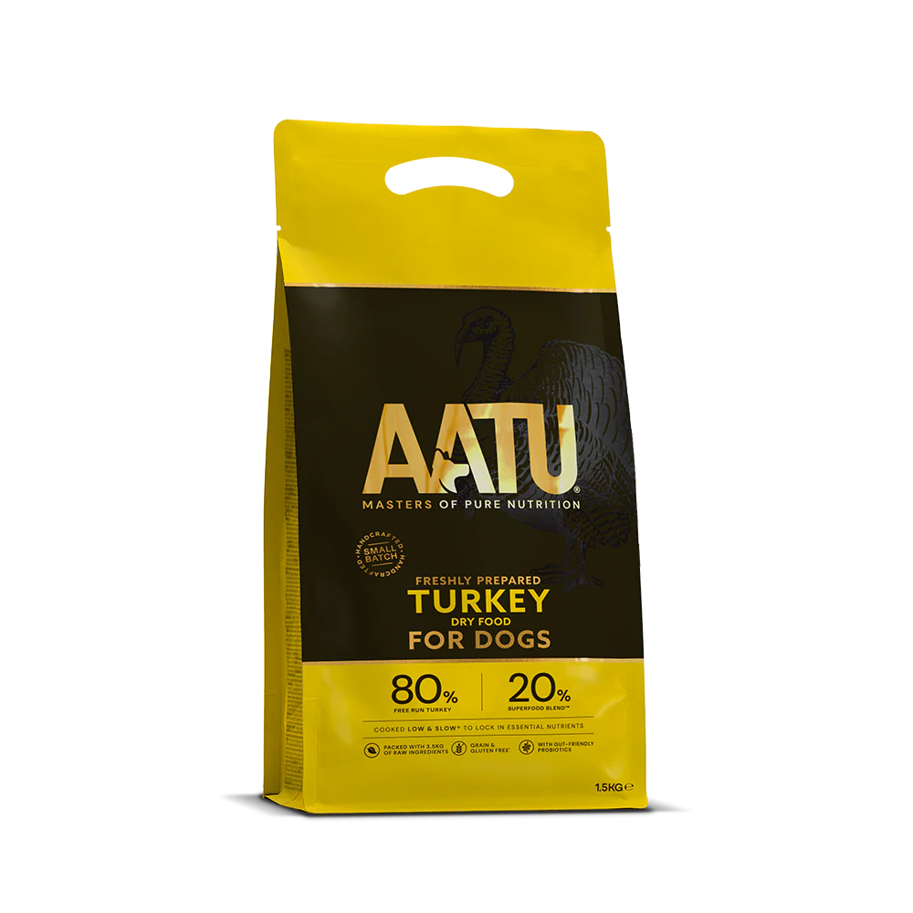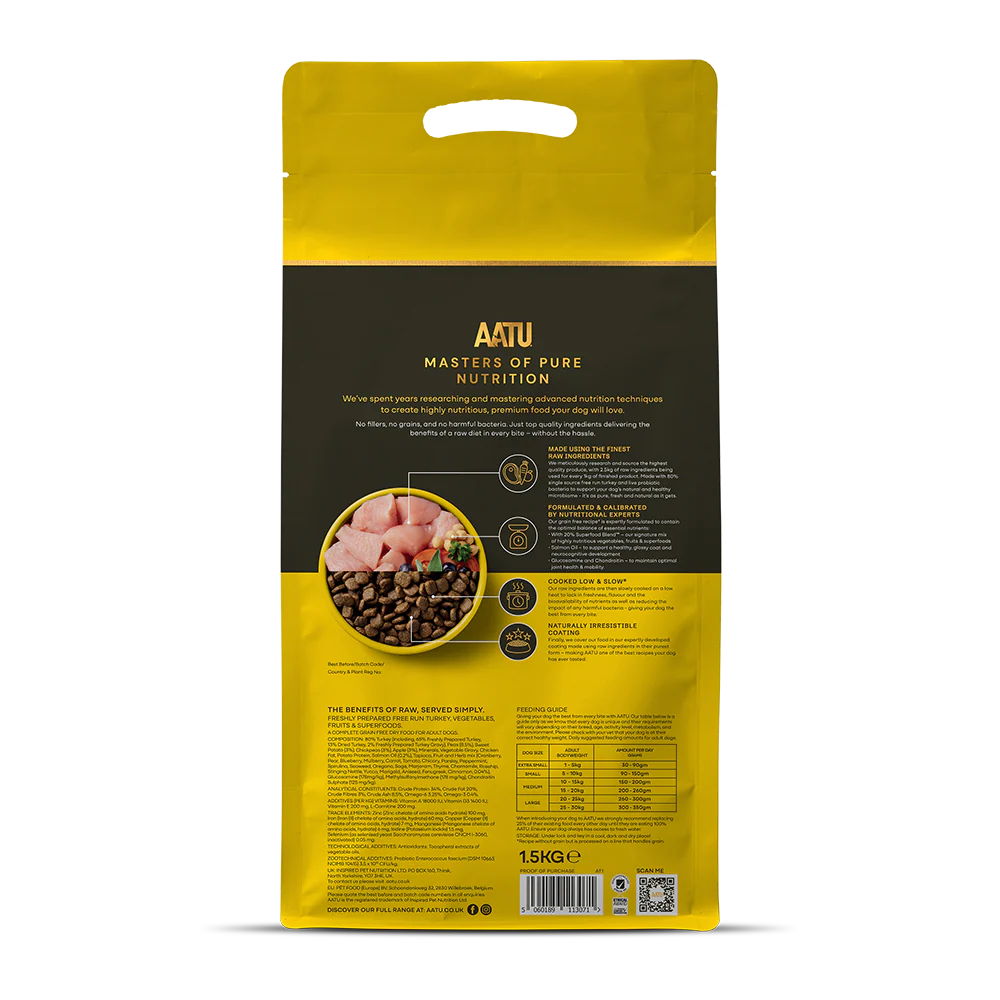 AATU for Dogs Turkey is handcrafted in small batch recipes, naturally made without artificial colours, without artificial preservatives, without artificial flavours and without GM ingredients. The fresh and raw protein is pre-cooked using our "low & slow"TM method to ensure efficient digestion of the meats.