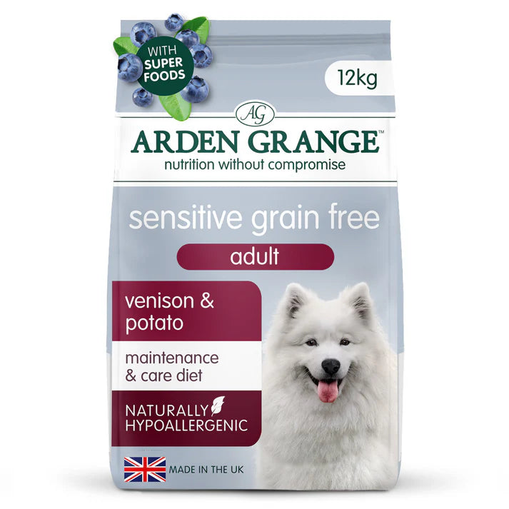 Arden Grange Sensitive Adult Venison & Potato is a premium grain-free dry dog food meticulously formulated for dogs with delicate digestion or sensitive skin. Containing 26% fresh venison, this carefully balanced recipe offers a naturally hypoallergenic diet suitable for all breeds. Enhanced with a unique blend of nutrient-rich superfoods, it supports optimal health, vitality, and well-being. Free from cereals and grains, it reduces the risk of dietary intolerances while providing essential nutrients for sustained energy and a healthy coat. Proudly made in the UK, this sophisticated formula ensures your dog receives a wholesome, nourishing meal every day.