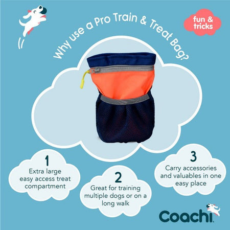 The professionals choice of dog treat bag, the Coachi Train & Treat! This extra large, easy-access dog treat bag has a secure hidden magnetic closure to keep your treats fresh and stop them falling out!