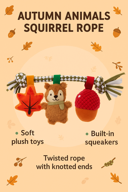 The Great & Small Autumn Animals Squirrel Rope Toy is designed to keep tails wagging all season long. Featuring a soft and squeaky squirrel, colourful leaf, and textured acorn – all attached to a sturdy rope – this toy is perfect for interactive play, gentle games of tug, or solo chewing sessions.