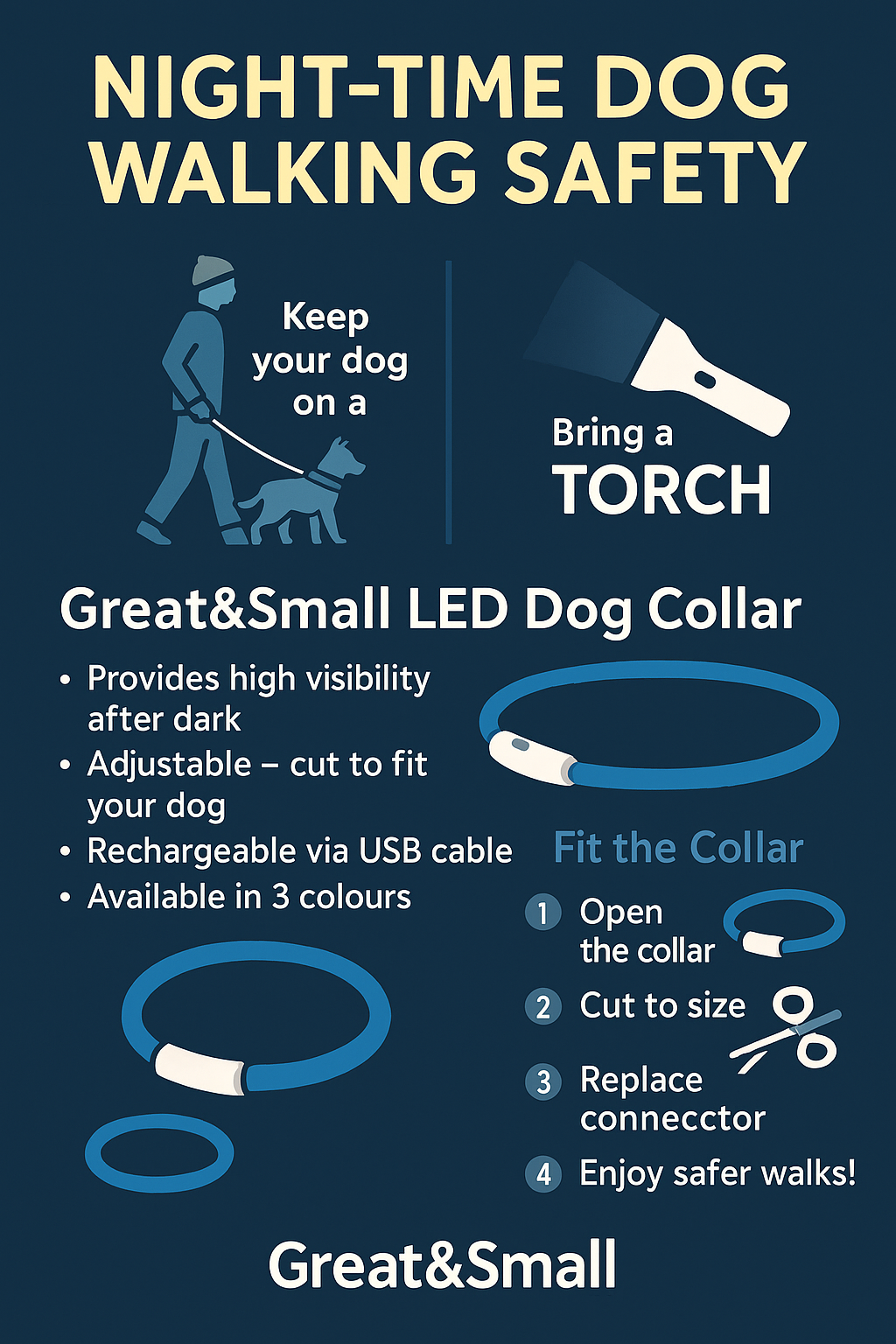 This collar is designed as a safety accessory only. It should always be used alongside your dog’s main collar and must never be attached to a lead or walking accessory.