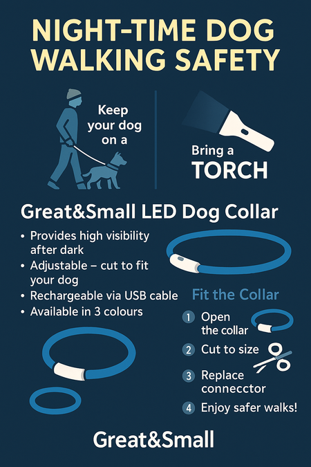 Keep your dog safe and visible after dark with the Great&Small LED Dog Collar. This bright, high-visibility collar can be cut to size for the perfect fit and comes complete with a mini USB charging cable for easy recharging.