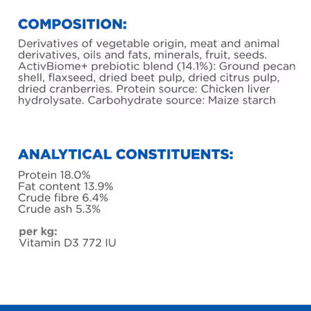 Derivatives of vegetable origin, meat and animal derivatives, oils and fats, minerals, fruit, seeds. ActivBiome+ prebiotic blend (14.1%): Ground pecan shell, flaxseed, dried beet pulp, dried citrus pulp, dried cranberries. Protein source: Chicken liver hydrolysate. Carbohydrate source: Maize starch.