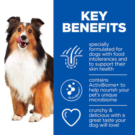 - Specially formulated for dogs with food intolerances and to support skin health.