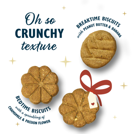 Breaktime Biscuits with peanut butter and banana. Bedtime Biscuits with a sprinkling of chamomile and passion flower.